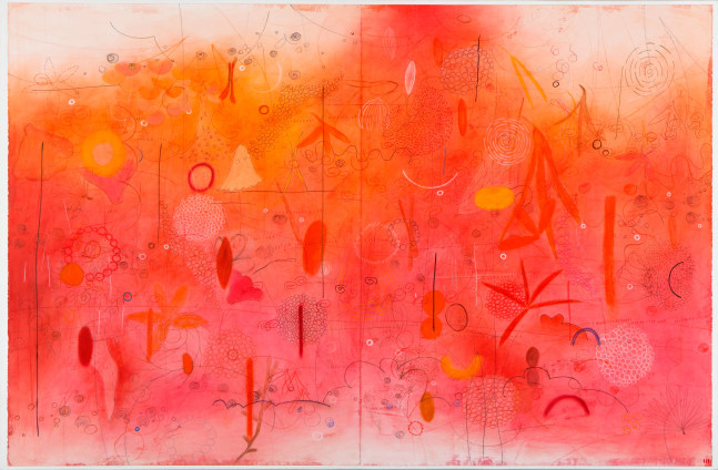 An enrolled member of the Navajo Nation, Emmi Whitehorse is an artist based in Santa Fe, New Mexico. Her paintings—four examples of which appeared in the 2024 Venice Biennale—are characterized by atmospheric fields of diffuse and shifting color that teem with elemental forms. Meditative and slow, Whitehorse’s painting is rooted in the Navajo philosophy of Hózhó, a concept connoting beauty, order, harmony, and balance. “My paintings tell the story of knowing land over time,” she says, “of being completely, microcosmically within a place.”
