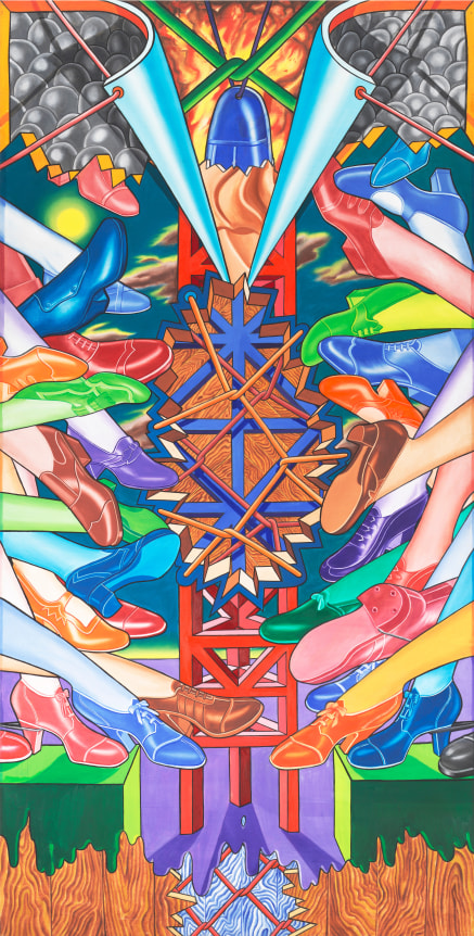 Green’s work is packed with paradoxes and impossibilities. Each is phantasmagoric but orderly. Items are fastened and balanced in agreement with the strict but inscrutable mechanical rules that undergird each universe. In paintings like Disclosing Enclosure (1968), Green ties spatial dimensions into a Gordian Knot. Two disembodied fingers unzip a two-dimensional face—revealing ice cream that oxymoronically bursts into flames. When an object is zipped open, showing itself to be a two-dimensional surface, it becomes three-dimensional in its new configuration. The counterintuitive logic and potent symbolism beg to be decoded, but any attempt results in a recursive paradox. The paintings are themselves a cycle of perpetual reconciliation and rupture.
