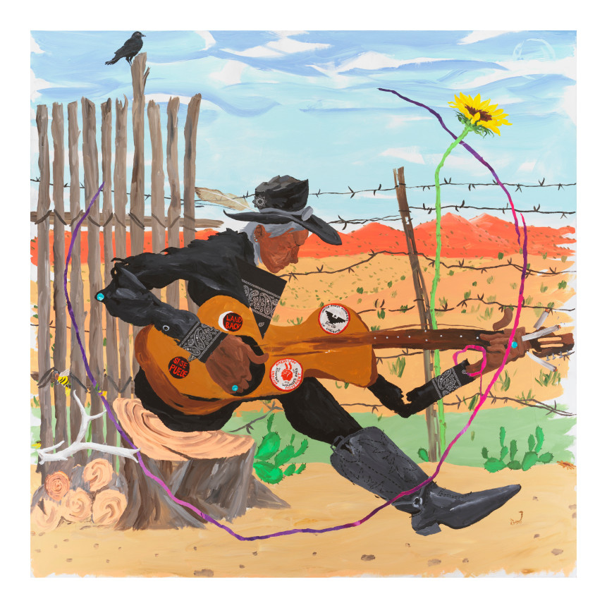 These unions and their strikes were organized around the premise that the farm workers’ struggle was part of a much broader movement for civil rights. In Si Se Puede (2023), the central figure strums on a guitar riddled with stickers reading “Si Se Puede,” “Land Back,” “American Indian Movement,” and “United Farm Workers.” The stickers are all reminiscent of the 1970s, except for one: Land Back. Land Back, introduced in 2018 by Arnell Tailfeathers, is a campaign by Native peoples that seeks to reestablish Indigenous sovereignty and political authority over unceded Indigenous territories. With this subtle blending of sovereign timelines, Cabeza de Baca connects new and old histories to be woven and rewoven. Cabeza de Baca’s father taught him that it is not only important that we know history, but that we acknowledge that history is actively woven within us. Within this series, Cabeza de Baca weaves together familial histories, campesino histories of the 1960s and 1970s, histories of landscape and color field painting, and future histories of land and Indigenous knowledge.